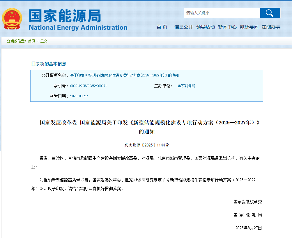为推动新型储能高质量发展,国家发展改革委、国家能源局研究制定了《新型储能规模化建设专项行动方案(2025—2027年)》。现予印发,请结合实际认真抓好贯彻落实。